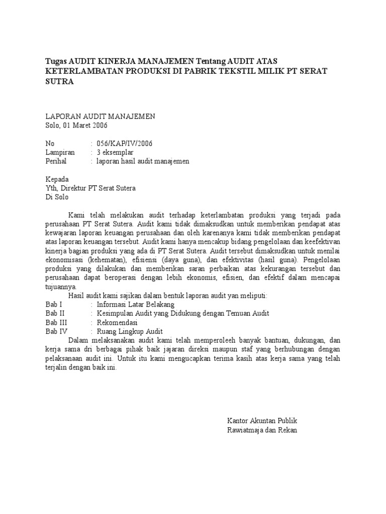 Surabaya 1 April 2009 No Lampiran Perihal. Sementara laporan audit bentuk Bab merupakan bentuk standar laporan yang berisi informasi secara lengkap yang menginformasikan dan mengkomunikasikan hasil audit kinerja Contoh isi Laporan audit kinerja bentuk surat dapat dilihat ilustrasi berikut ini sementara format laporan dapat mengikuti tata naskah dinas yang berlaku dimasing-masing instansi. Laporan hasil audit manajemen Kepada Yth Direktur PT Serat Sutera Di Solo Kami telah melakukan audit terhadap keterlambatan produksi yang terjadi pada perusahaan PT Serat Sutera.
